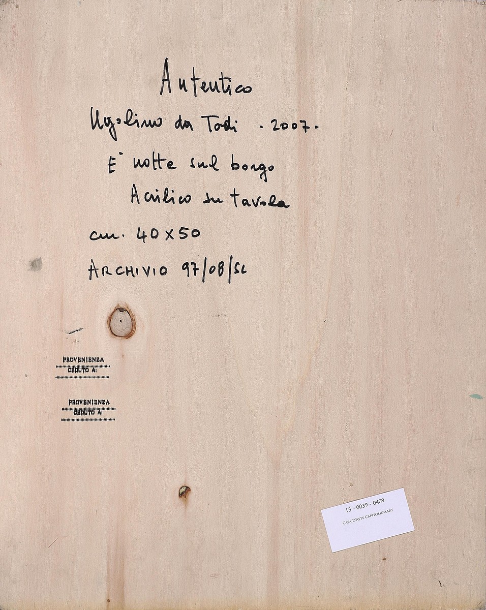 DA TODI UGOLINO Notte sul borgo. 2007. Acrilico su tavola. Cm 40,00 x 50,00. Firma e data in basso a destra. Al retro firma, data e numero d'archivio.