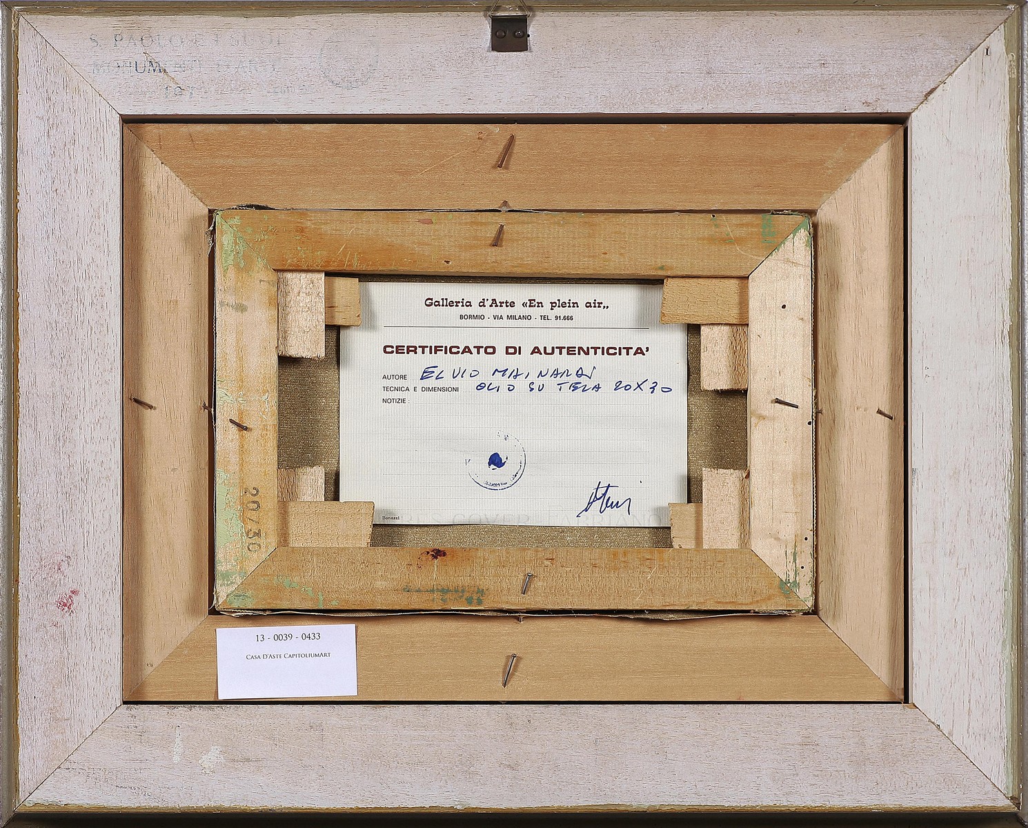 MAINARDI ELVIO (n. 1934) Senza titolo. 1970. Olio su tela. Cm 30,00 x 20,00. Firma e data in basso a sinistra. Al retro Cartiglio Galleria d'Arte - En Plain Air, Bormio. Cornice presente
