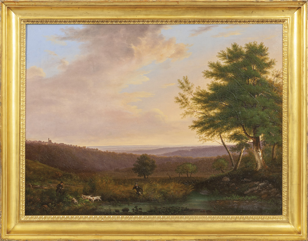 Scuola lombarda inizi sec.XIX (Giuseppe Canella) "Alla posta lungo il fiume" olio, cornice coeva in legno finemente intagliato e dorato