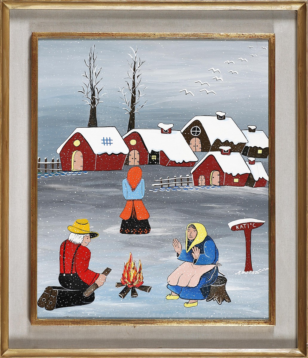 KATI'C Davanti al fuoco. 2004. Acrilico su tela. Cm 50,00 x 60,00. Al retro firma per autenticità, anno e titolo. Autentica a cura dell' Archivio Storico degli Artisti Italia - '900 con timbro dell'Associazione Nazionale Amici del Quadrato. Cornice presente