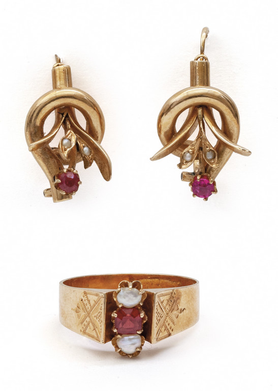 Lotto composto da un anello ed un paio di orecchini in oro rosa con microperle e rubini di sintesi