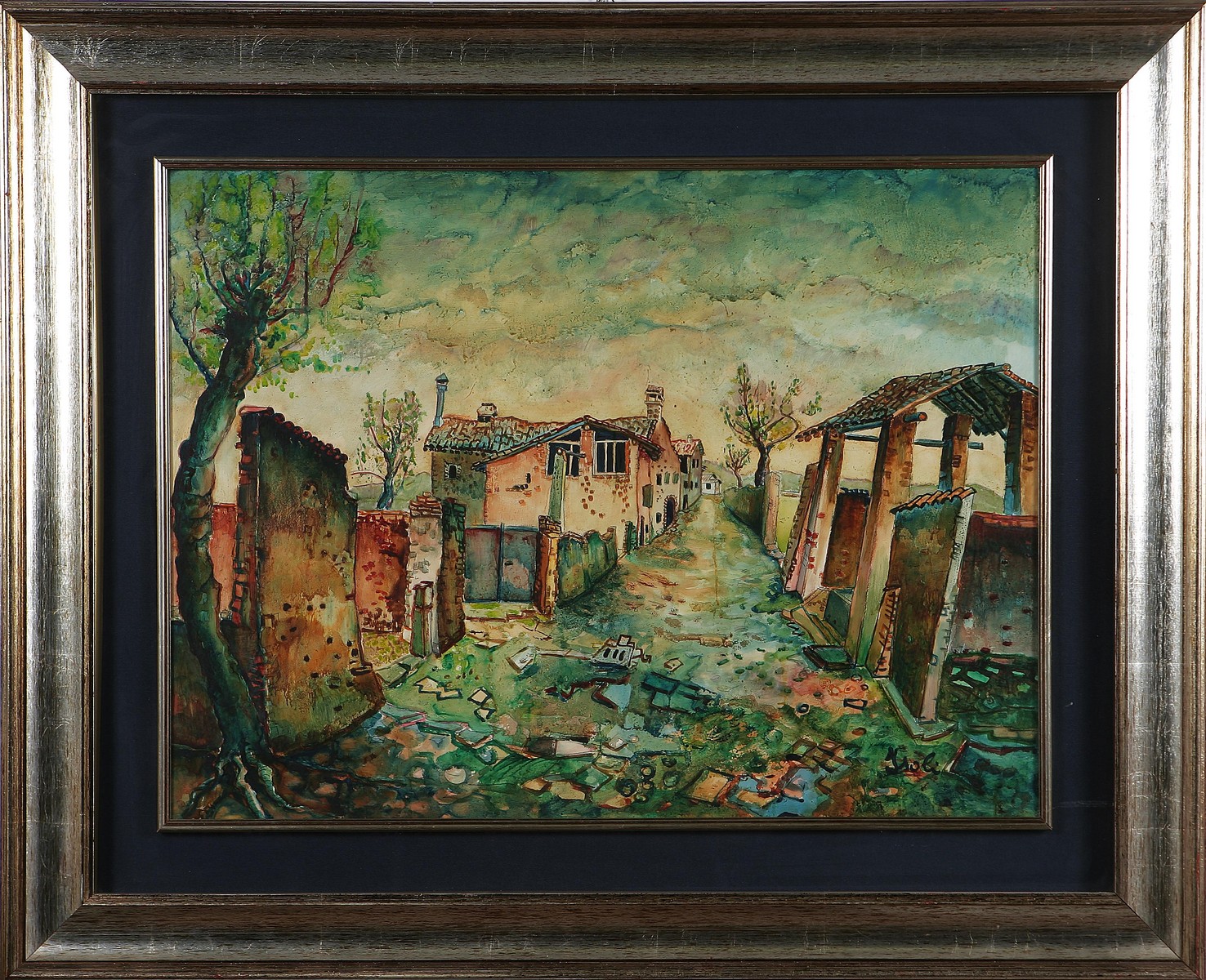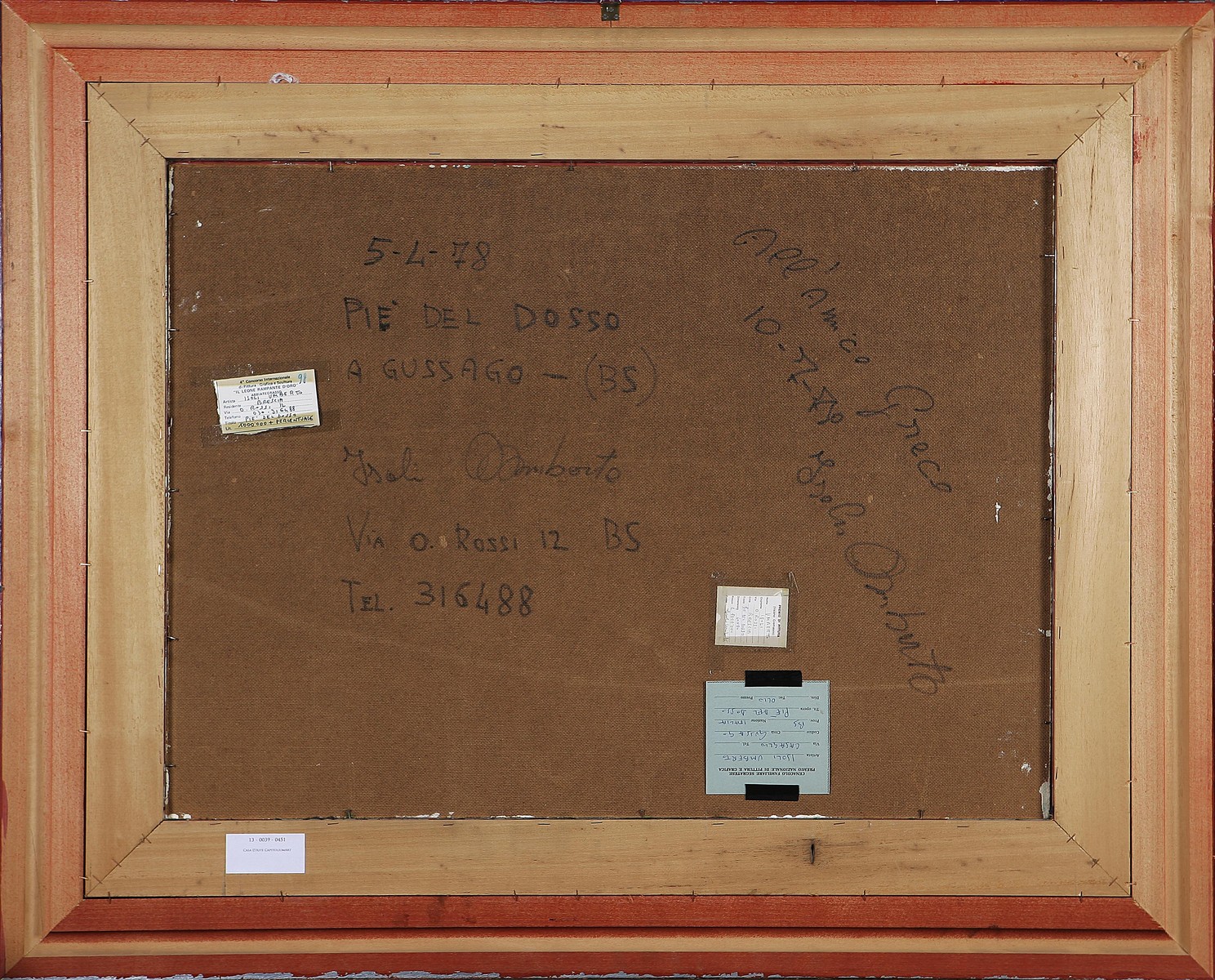 ISOLI UMBERTO Senza titolo. Olio su faesite. Cm 80,00 x 60,00. Al retro dedica, cartiglio del 4° Concorso Internazionale di pittura, grafica e scultura -Il leone rampante d'oro-, Abbiategrasso; cartiglio del Premio di pittura, Vaiano Cremasco. Firma in basso destra. Cornice presente