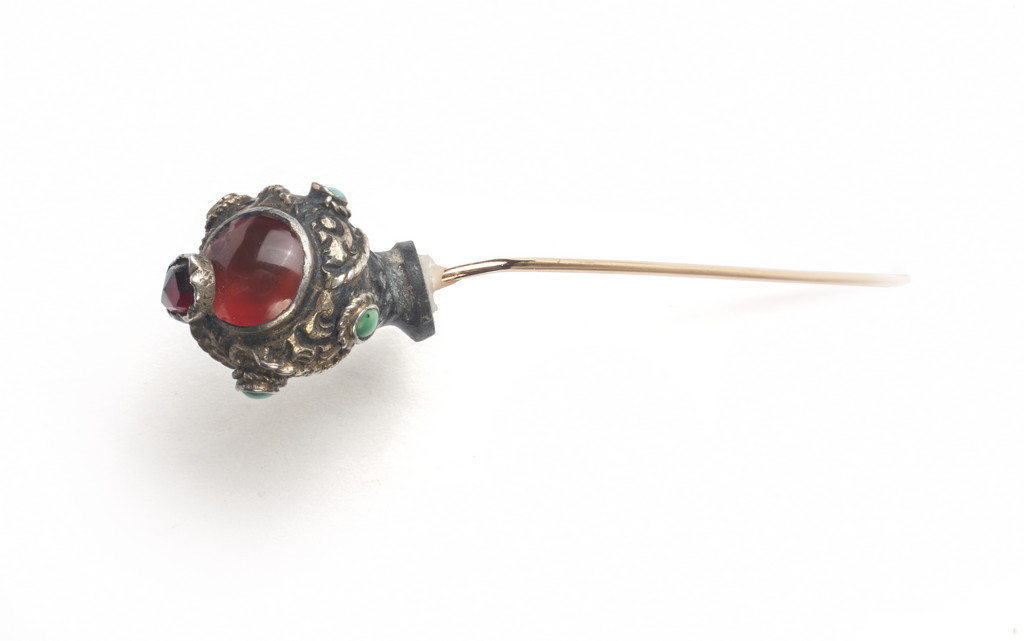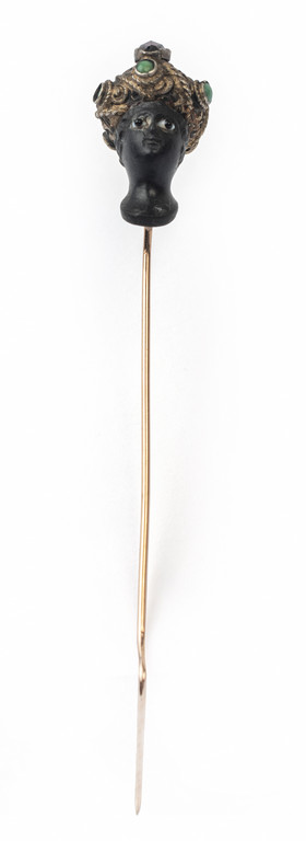 Spilla da cravatta epoca '800 in oro e argento brunito a forma di testa di moretto con corniola, granato e piccole turchesi