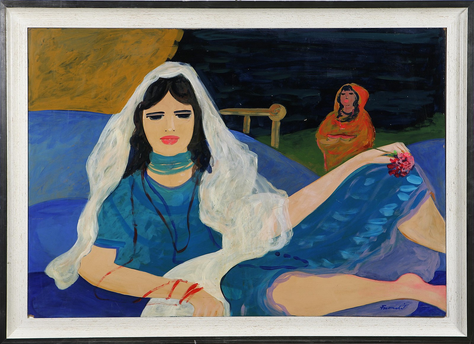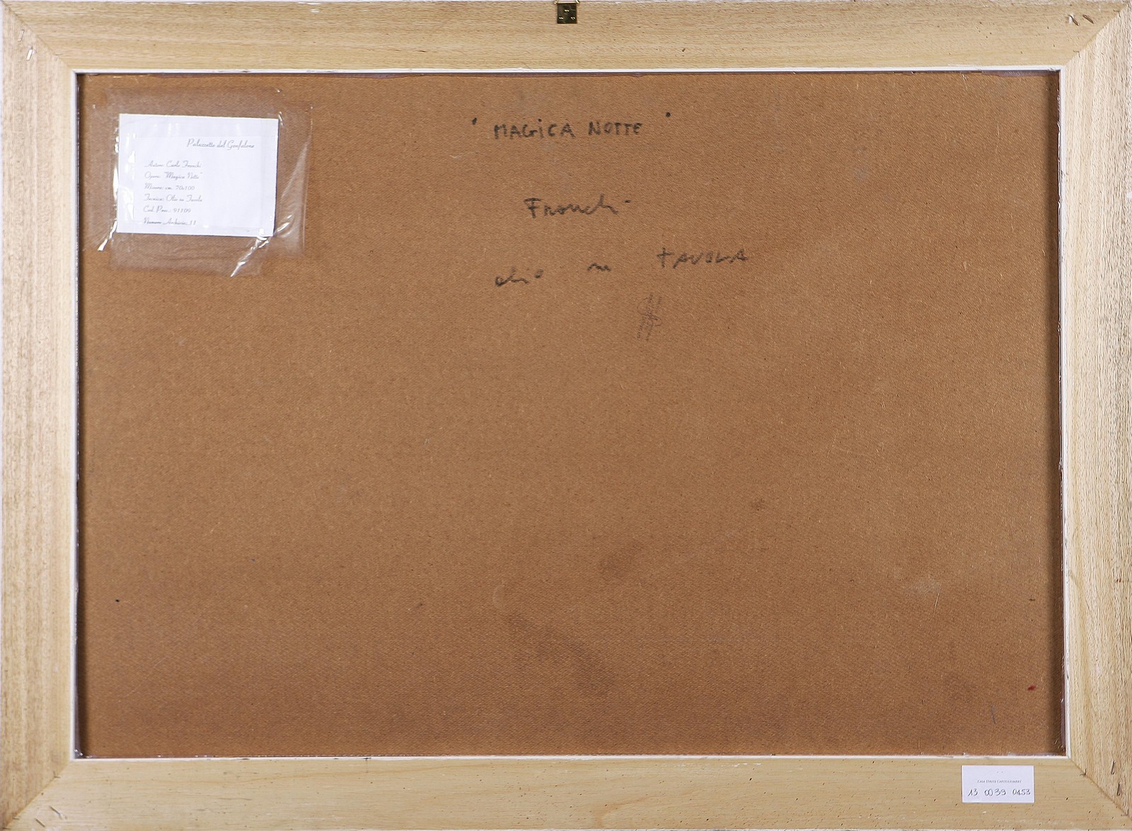 FRANCHI CARLO Magica notte. Olio su faesite. Cm 100,00 x 70,00. Firma in basso a destra. Al retro firma, titolo e Cartiglio del Palazzetto del Gonfalone con relativo numero d'archivio. In allegato all'opera brochure informativa riguardante l'artista. Cornice presente