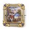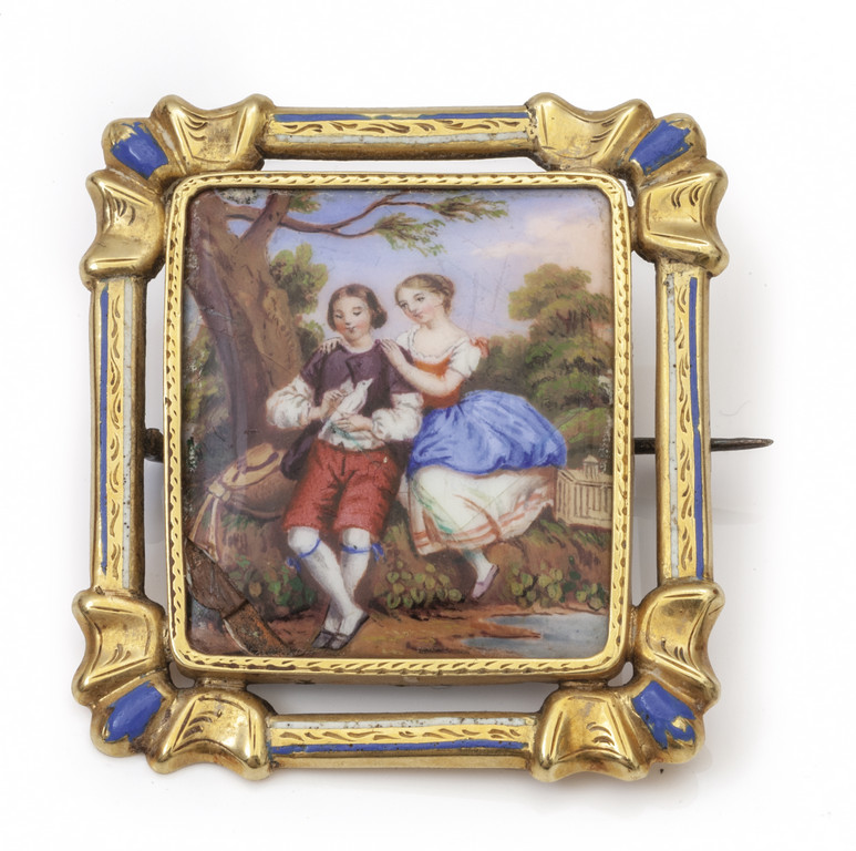 Spilla in oro giallo basso titolo epoca primi '900 con smalti azzurri e fiocco centrale dipinto con soggetto galante