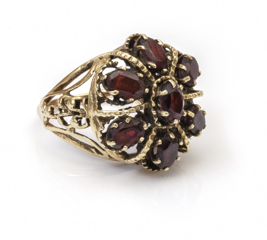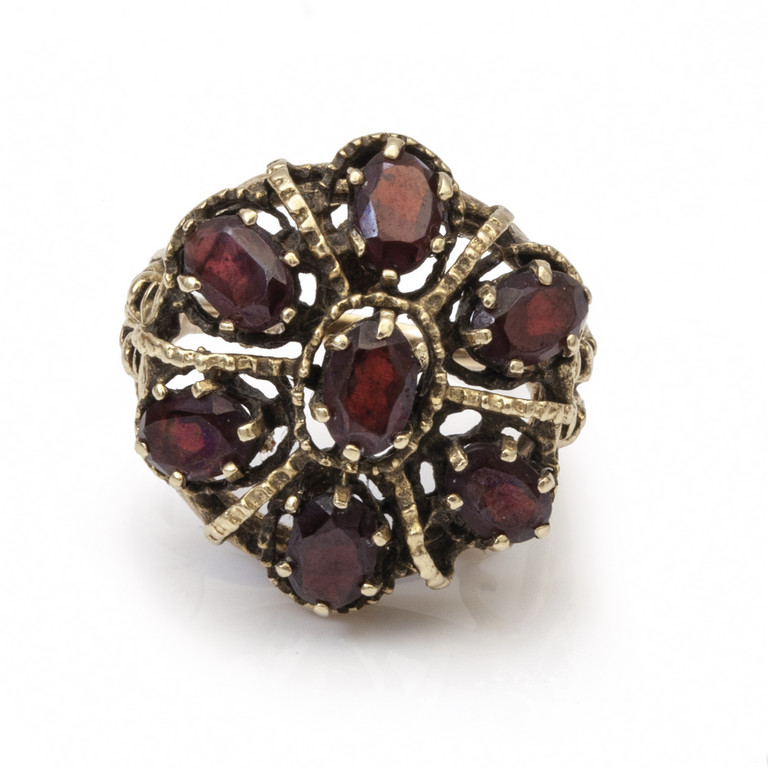 Anello in oro giallo basso titolo con incastonati sette granati naturali taglio ovale