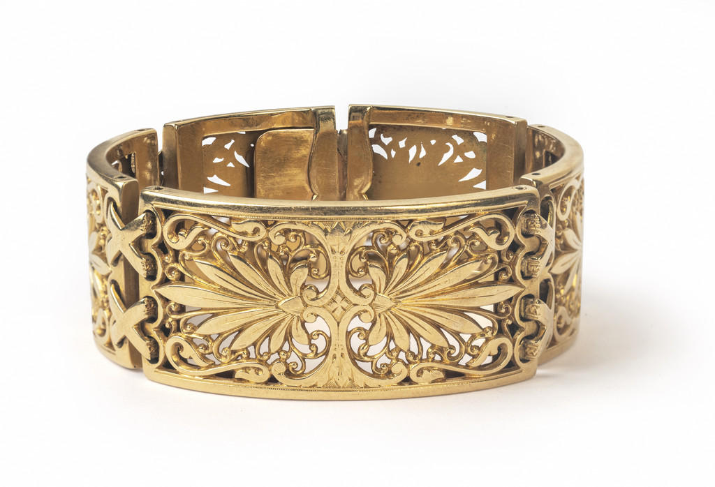 Particolare bracciale in oro giallo di forma semi rigida formato da cinque placche traforate con motivo a "palmette"