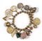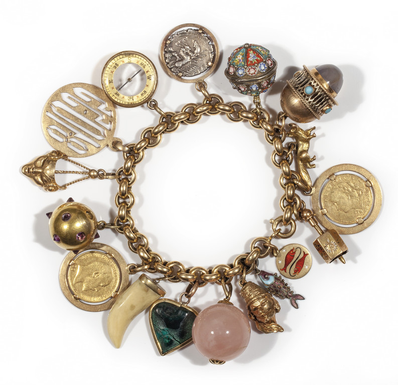 Bracciale in oro giallo maglia rollò portante quindici ciondoli in oro giallo e due in argento di diverse forme e materiali