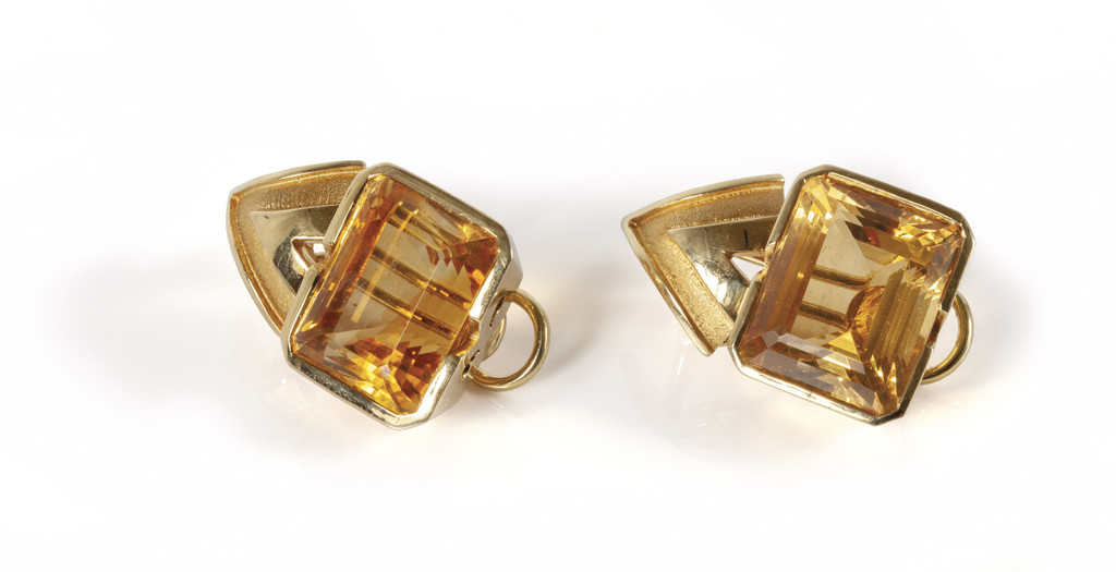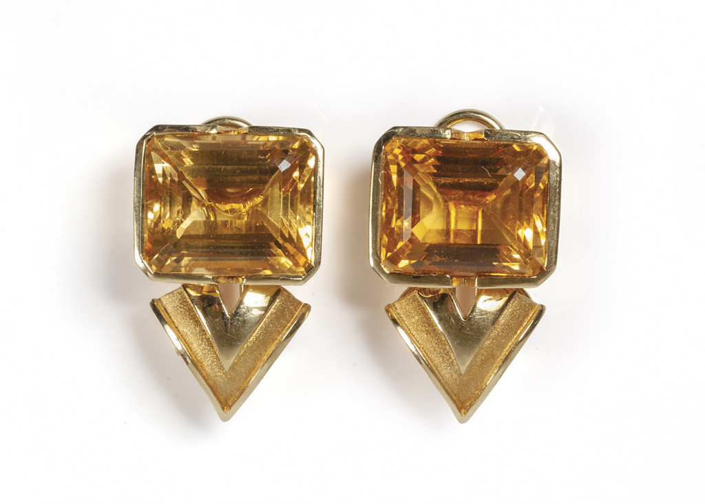 Orecchini in oro giallo con montati due quarzi citrini lemon taglio ottagonale per tot ct 15 circa