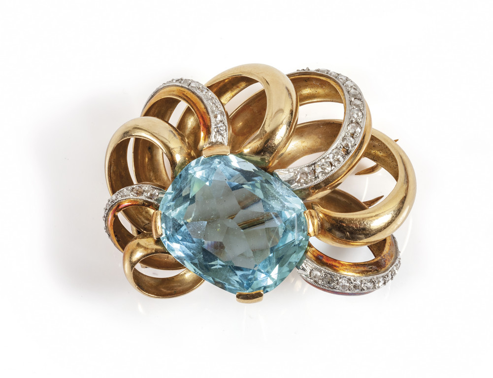 Broche in oro giallo epoca anni '40 con incastonati diamanti taglio brillante per tot 0,40 circa ed un importante acquamarina taglio cuscino di ct 15 circa