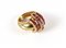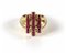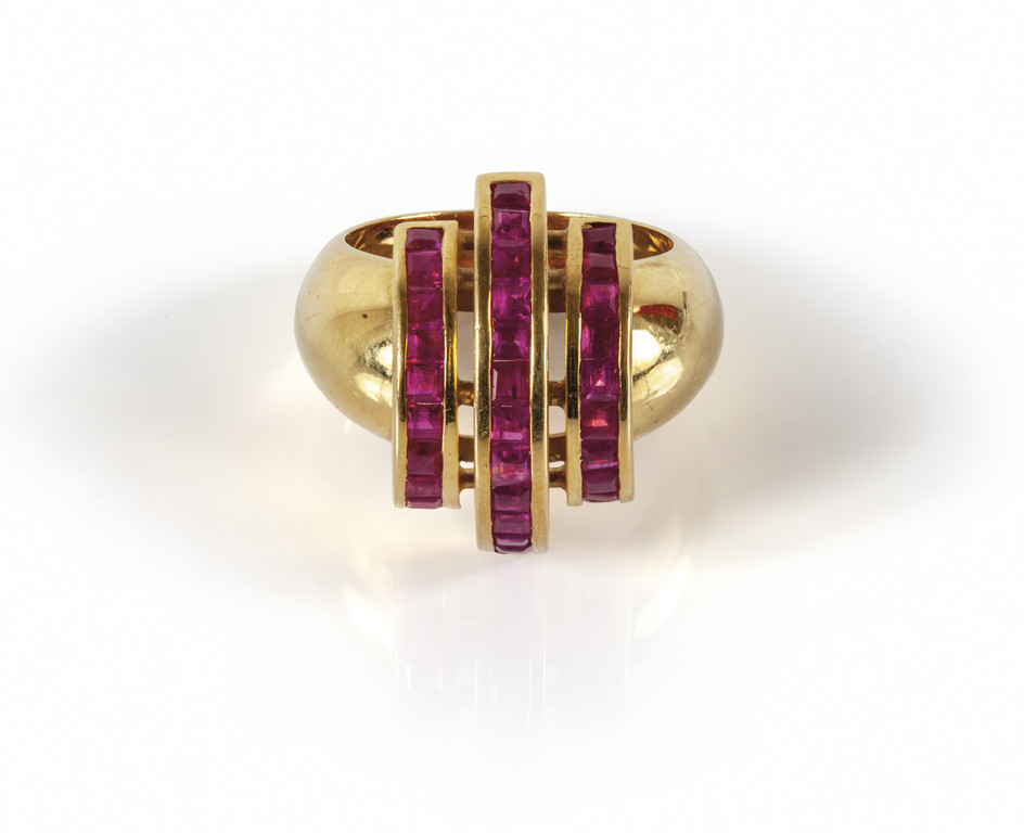 Anello in oro giallo con tre cavallotti sui quali sono incastonati rubini taglio carrè per tot ct 1,20 circa