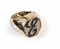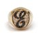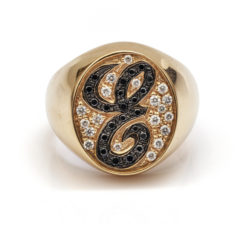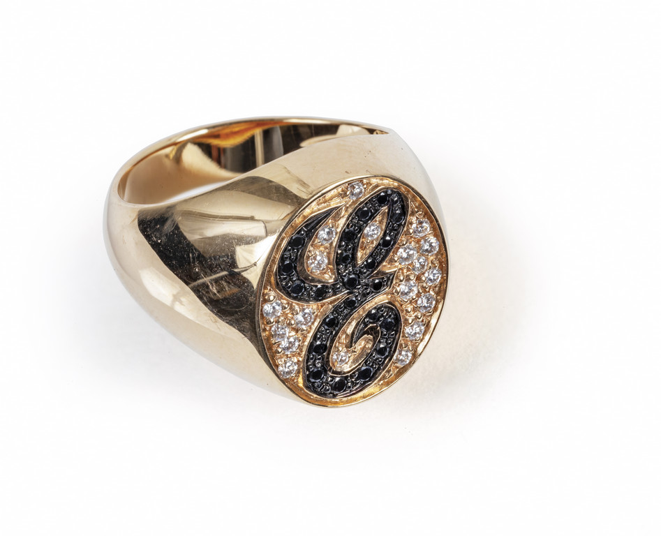 Anello modello chevalier in oro rosa con montati piccoli brillanti che fanno da sfondo alla lettera E realizzato in diamanti
