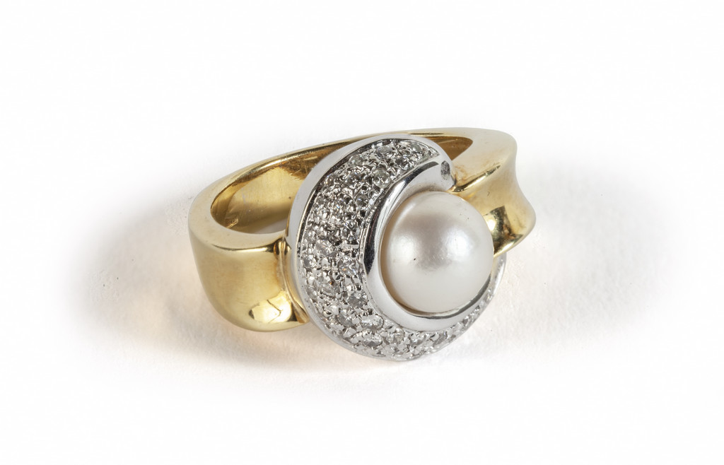 Anello in oro giallo e bianco con montata una perla coltivata di mm 8 e piccoli diamanti taglio brillante a contorno