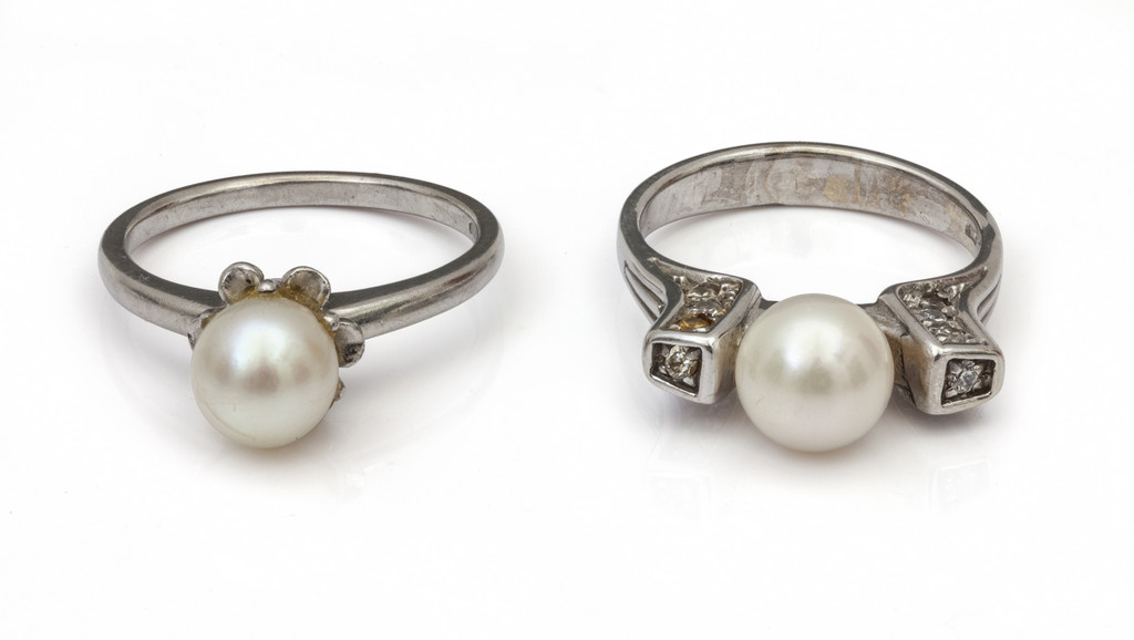 Lotto composto da due anelli in oro bianco con montate perle coltivate e diamanti taglio brillante bianchi e fancy