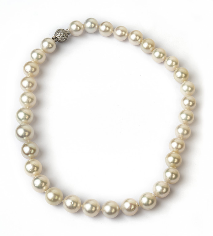 Collana composta da trentatrè perle australiane degradè mm 12/12 chiusura a forma di sfera incastonata a pavè con diamanti taglio brillante per tot ct 1,20 circa