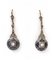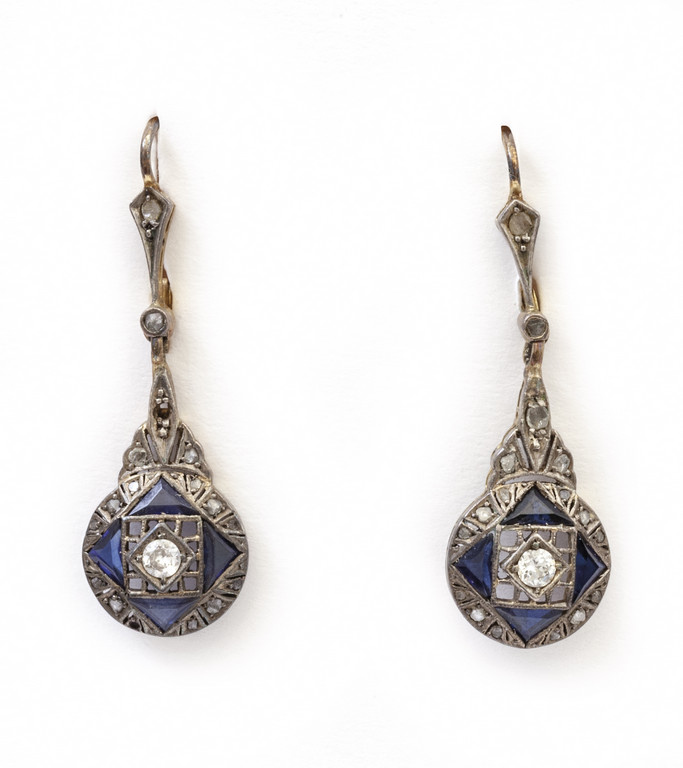 Orecchini in oro bianco a forma di monachella epoca Art Decò con incastonati due piccoli diamanti, rosette di diamante e zaffiri di sintesi taglio calibrè