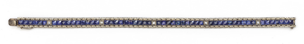 Particolare bracciale in oro bianco epoca anni '30 con zaffiri taglio briolette nella parte centrale per tot ct 7,00 circa e cinque piccoli brillanti ai lati