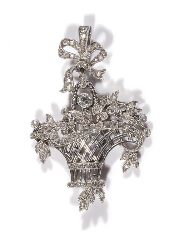Particolare e raffinata spilla epoca anni '40 in oro bianco a forma di cestino con incastonati diamanti vecchio taglio per tot ct 0,50 circa