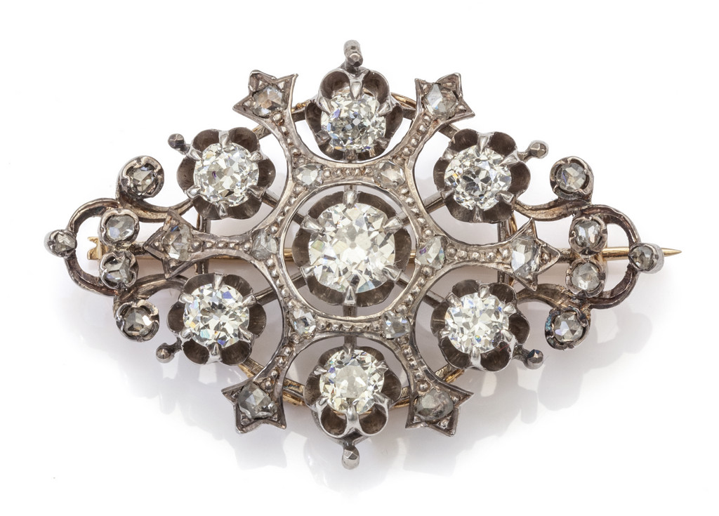 Particolare spilla epoca primi '900 in oro rosa con incastonati sette diamanti naturali vecchio taglio per tot ct 1,20 circa e piccoli diamanti taglio rosetta a contorno