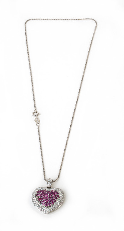 Catenina in oro bianco portante ciondolo a forma di cuore interamente incassato con tecnica a pavè con diamanti taglio brillante per tot ct 1,10 circa e rubini per tot ct 1,50 circa
