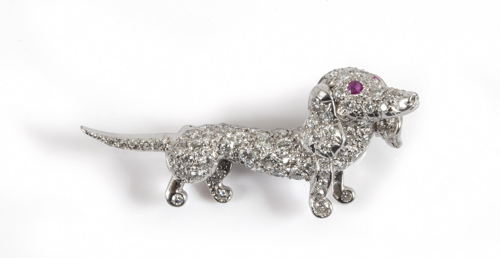 Piccola spilla in oro bianco a forma di bassotto con incastonati con tecnica a pavè diamanti naturali taglio brillante per tot ct 0,60 circa e due piccoli rubini