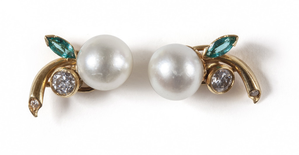 Orecchini in oro giallo a forma di "mela" con montate due navette in smeraldo per tot ct 0,15 circa e due diamanti taglio brillante per tot ct 0,20 circa