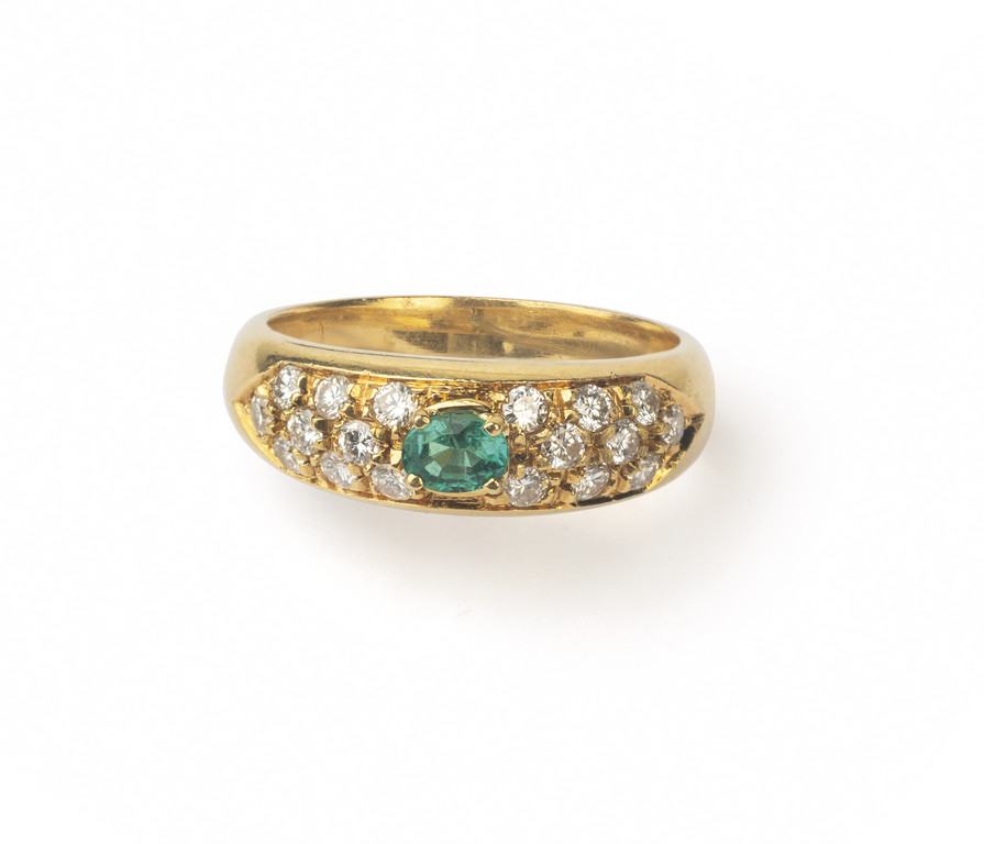 Anello in oro giallo con incastonato un piccolo smeraldo e piccoli brillanti a contorno