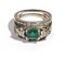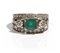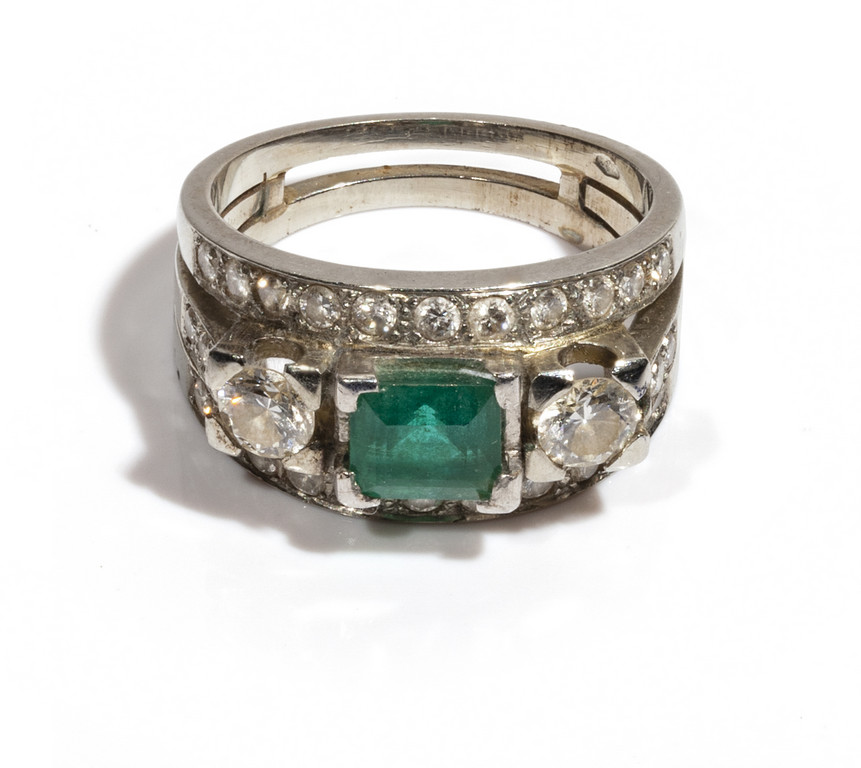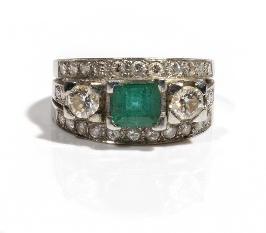 Anello in oro bianco a forma di fascia con incastonato smeraldo taglio ottagonale di ct 0,40 circa, due diamanti taglio brillante per tot ct 0,40 circa e piccoli brillanti a contorno