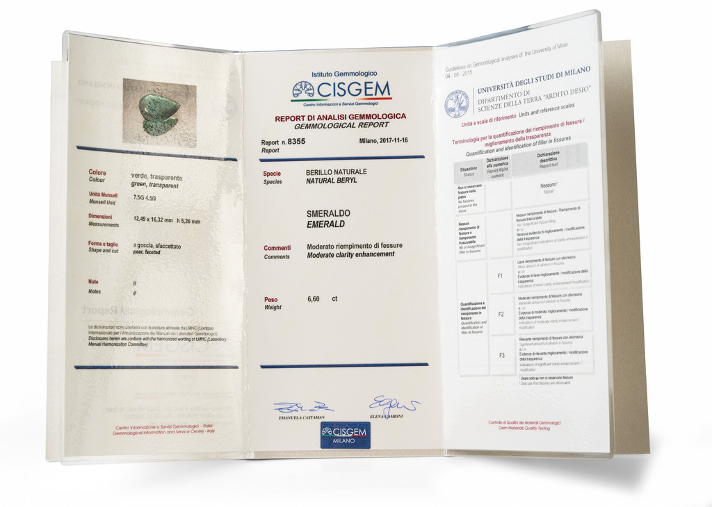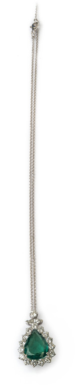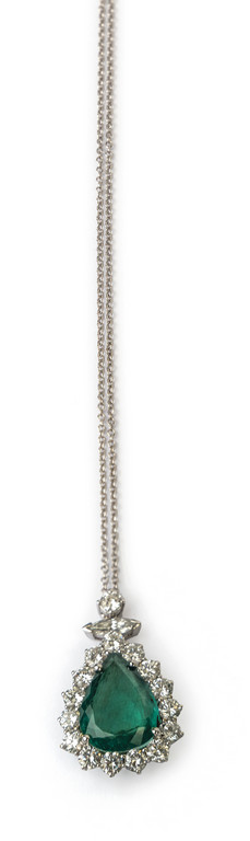 Collana in oro bianco maglia rollò portante ciondolo a forma di goccia dove è incastonato uno smeraldo naturale taglio goccia di ct 6,60 e diamanti taglio brillante e navette a contorno per tot ct 3,00 circa