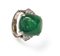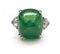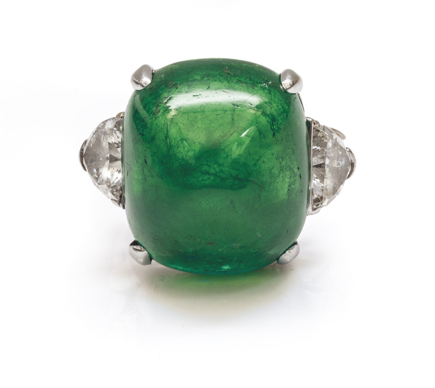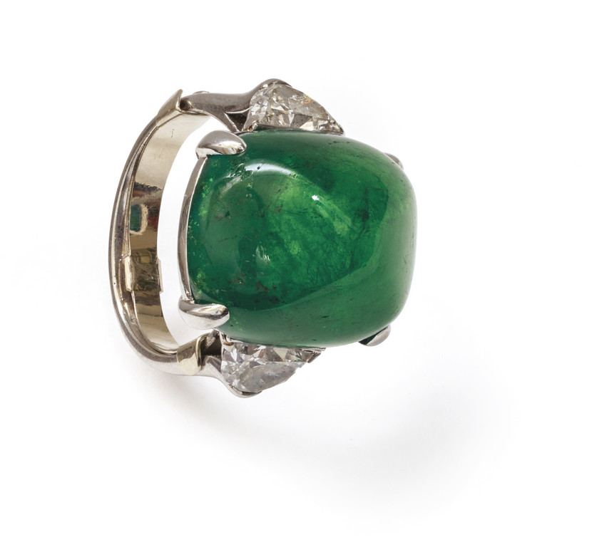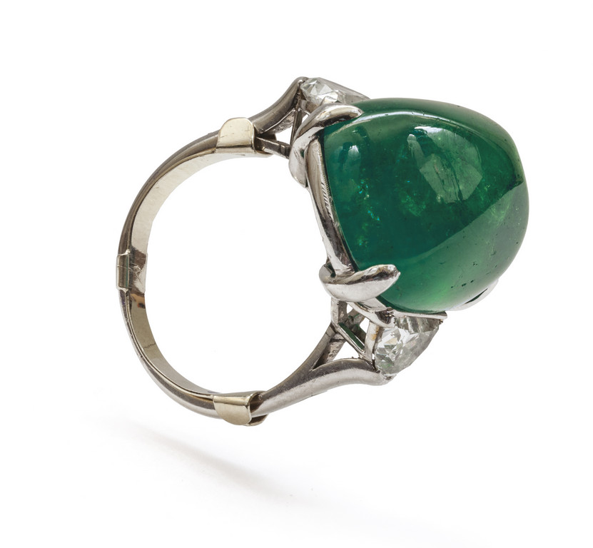 Anello in oro bianco con montato un importante smeraldo di vecchia estrazione taglio cabochon a piramide di 7,00 ct circa e due diamanti taglio tricorno per tot ct 1,20 circa