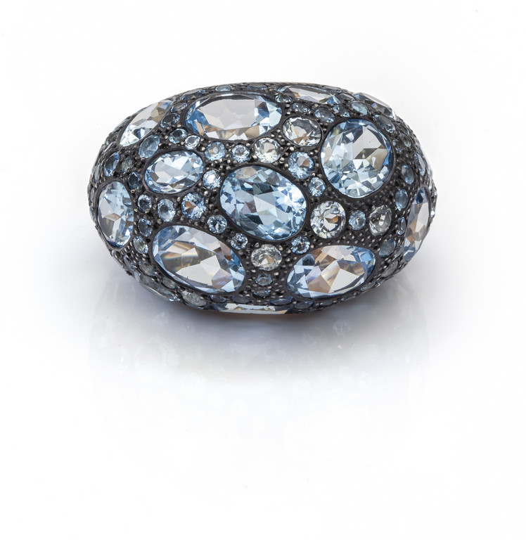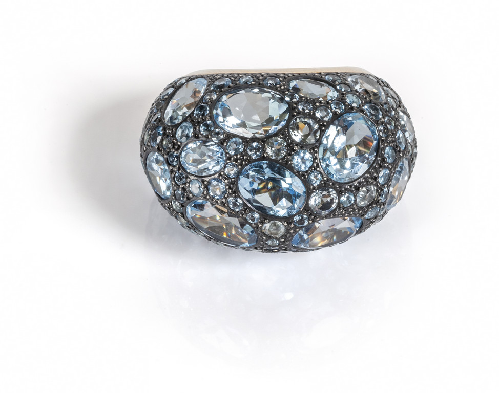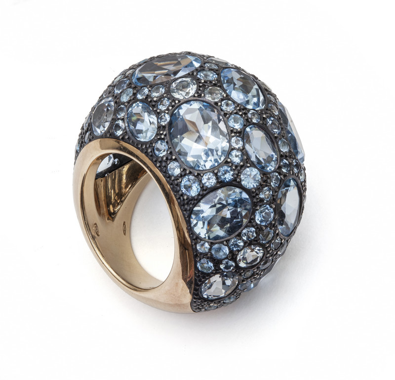 Anello in oro giallo a forma di fascione firmato Pomellato con incastonati topazi azzurri naturali taglio ovale e taglio brillante