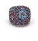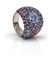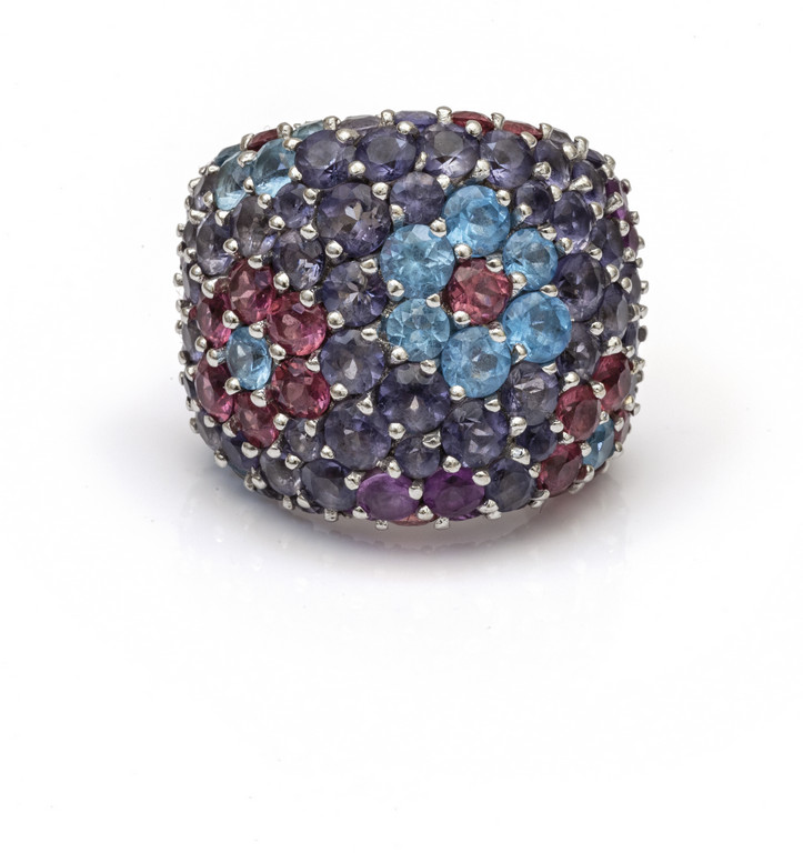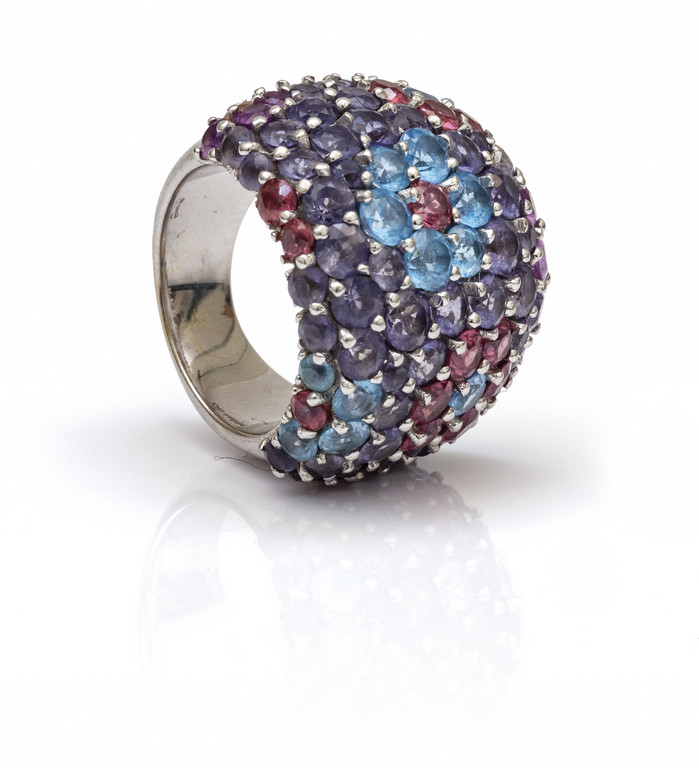 Anello in oro bianco a forma di fascione con montate ametiste, topazi azzurri, tormaline con tecnica a pavè