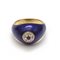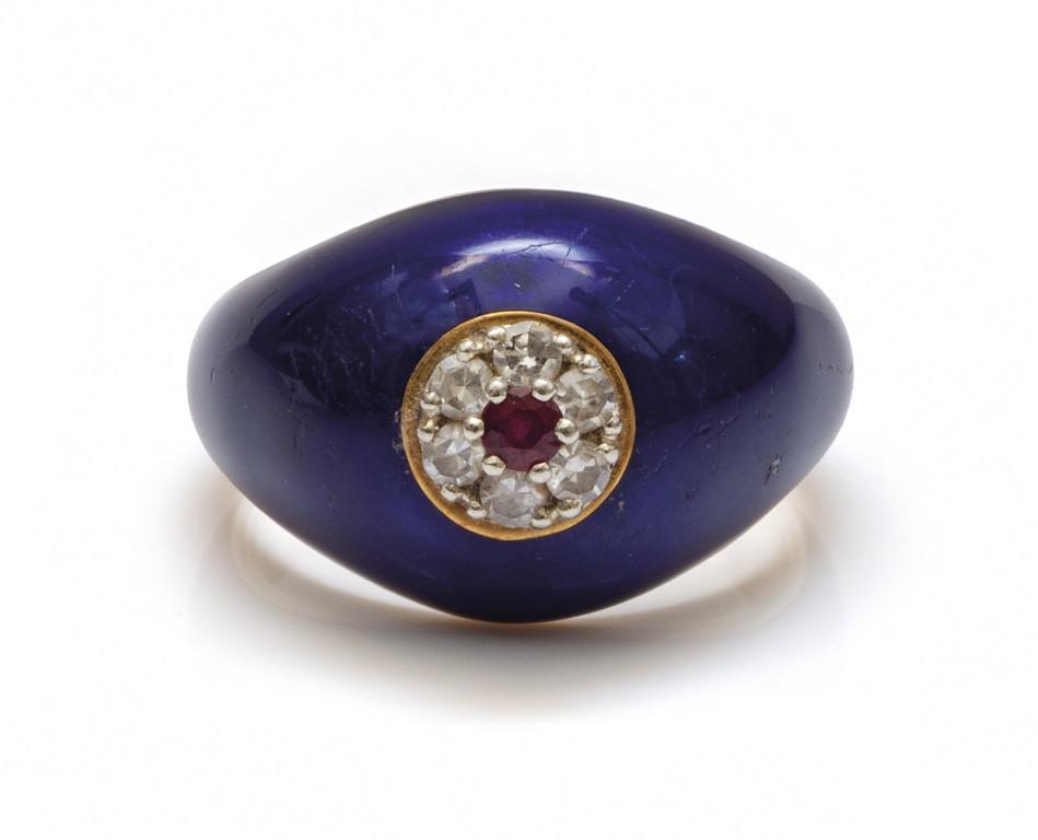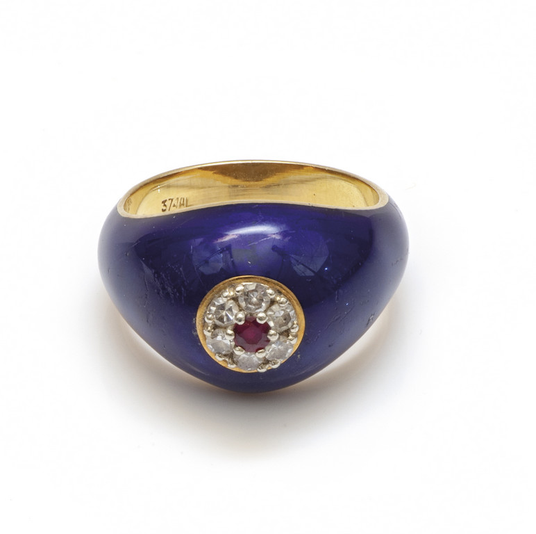 Anello in oro giallo con incastonati piccoli brillanti, un piccolo rubino e smalto blu