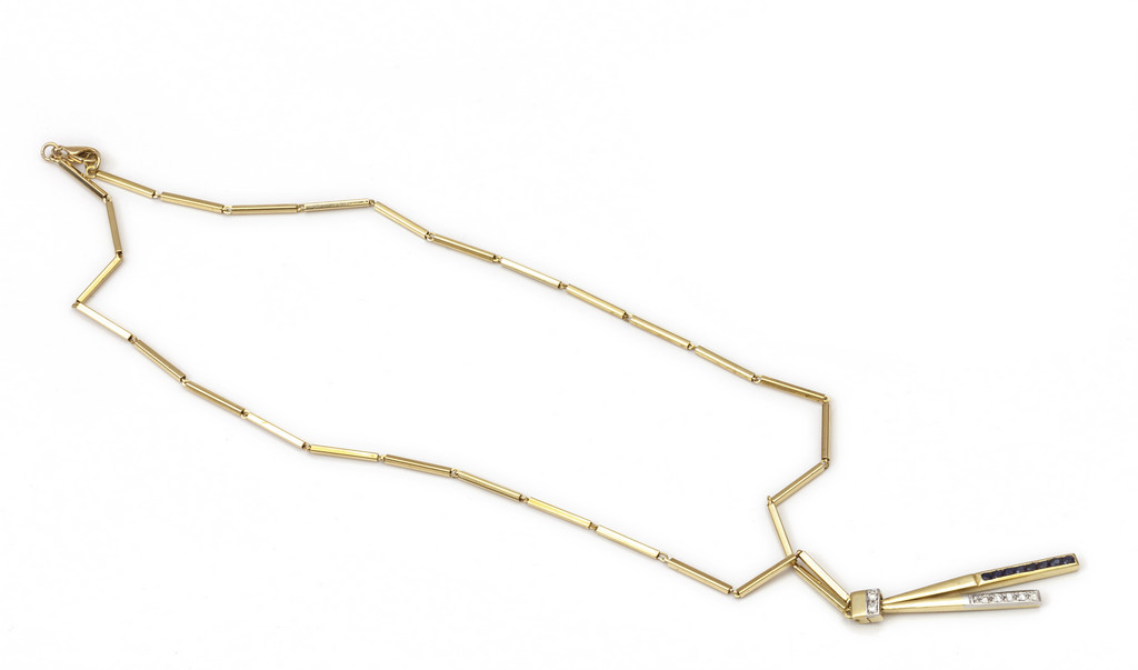 Collana in oro giallo con maglia formata da segmenti che terminano con due parti pendenti sulle quali sono incastonati piccoli brillanti e piccoli zaffiri