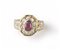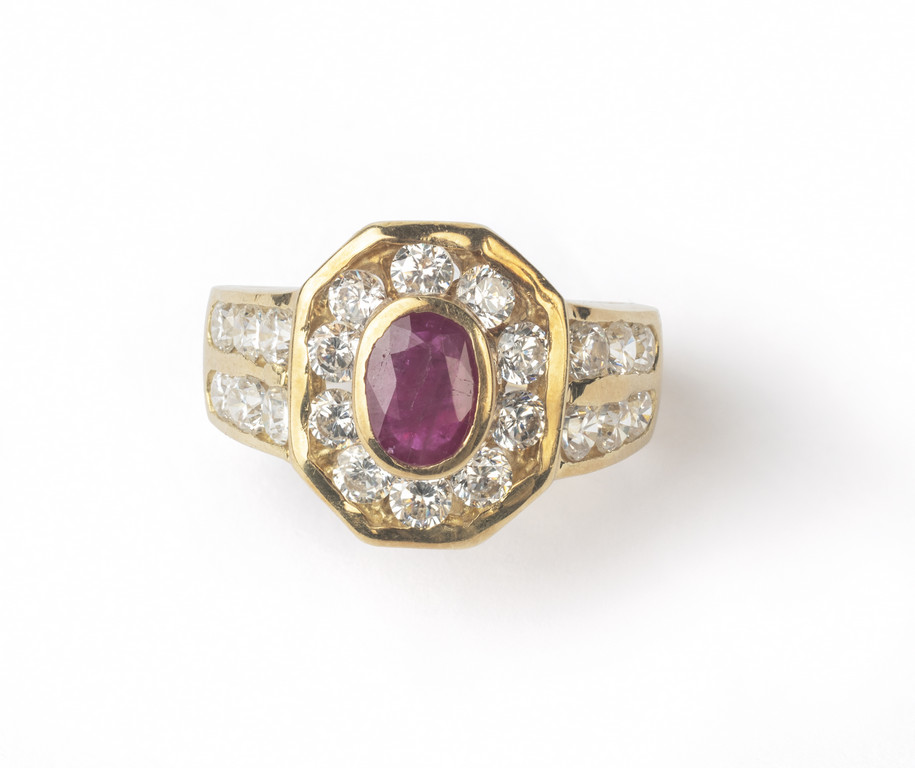 Anello in oro giallo con incastonato un rubino centrale taglio ovale e zirconi a contorno