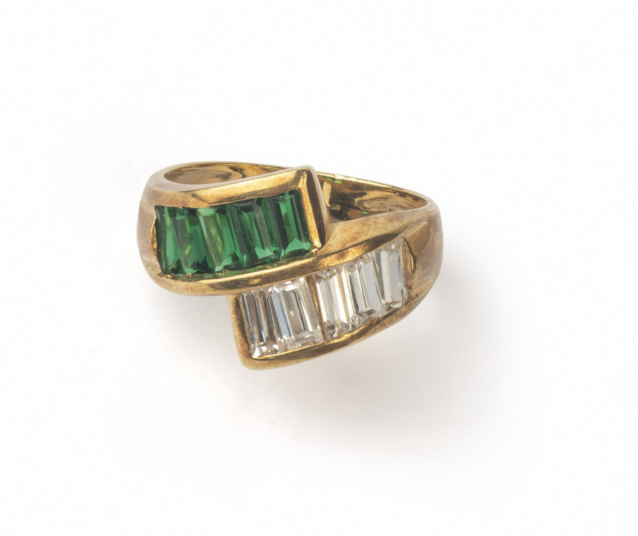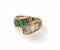 Anello in oro giallo a forma di contrarier con incastonate pietre di sintesi taglio baguette di colore verde e bianco