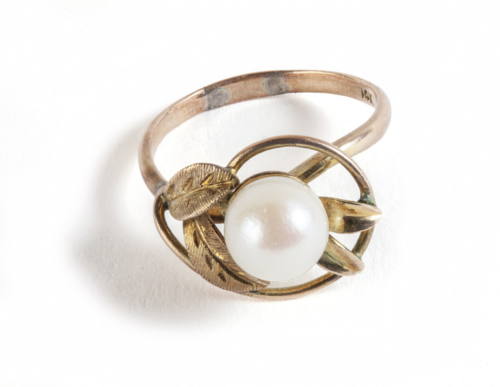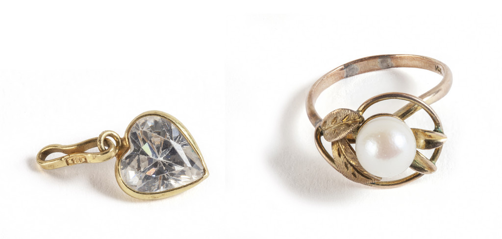 Lotto composto da un anello in oro basso titolo con montata una perla coltivata di mm 7 ed un piccolo ciondolo in oro giallo a forma di cuore con montato zircone