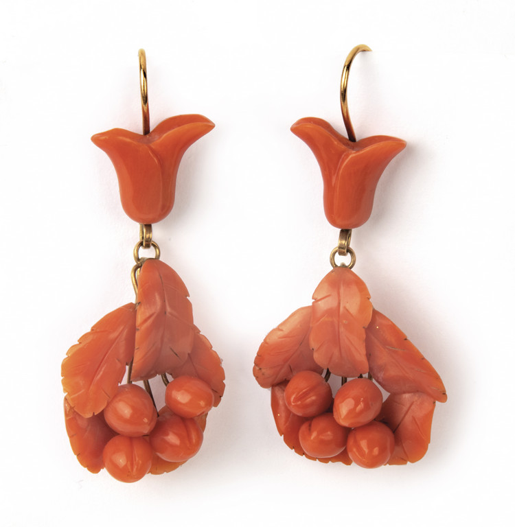 Orecchini borbonici in oro rosa di forma pendente con foglie e boccioli in corallo tinta salmone