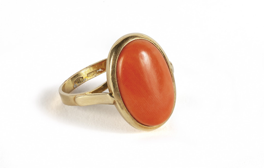 Anello in oro giallo con incastonato corallo tinta salmone taglio cabochon