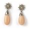 Orecchini di forma pendente in oro bianco con incassati brillanti per tot ct 0,25 ct circa portanti due gocce di corallo rosa chiaro di mm 16x11