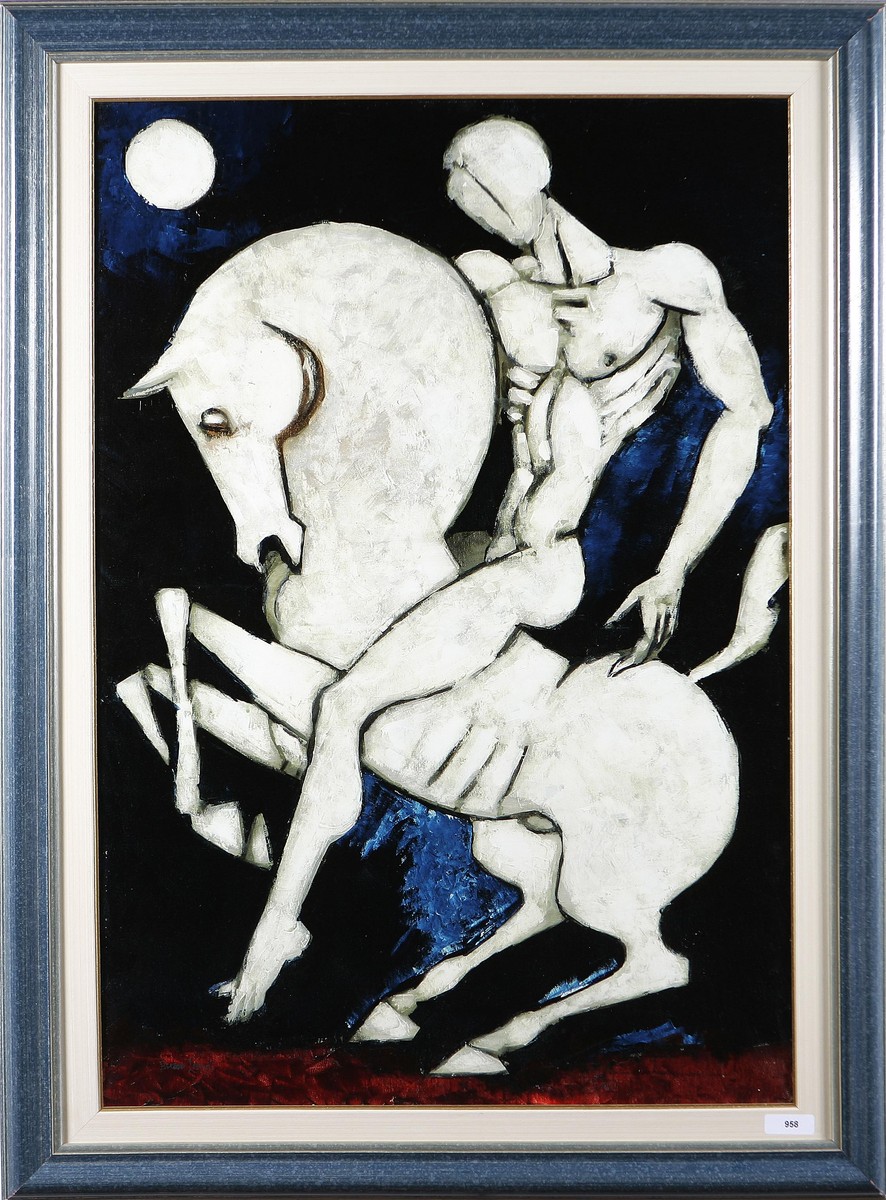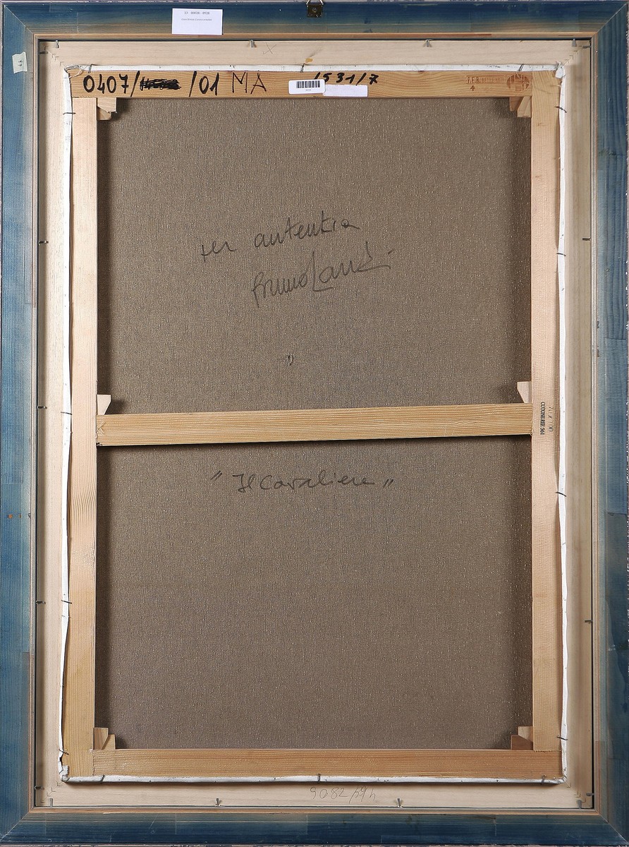 LANDI BRUNO (n. 1941) Il cavaliere. 2001. Olio su tela. Cm 70,00 x 100,00. Firma in basso a sinistra. Al retro titolo e firma per autentica. Autentica su fotografia a cura dell'Archivio fotografico generale delle opere di Bruno Landi. Cornice presente