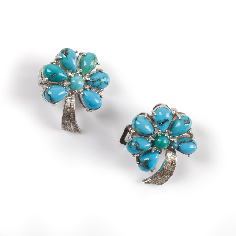 Orecchini in oro bianco a forma di fiore con incastonate quattordici turchesi taglio cabochon