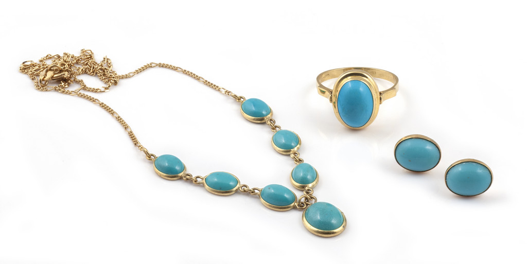Piccola parure in oro giallo composta da girocollo, orecchini ed anello con incastonate turchesi naturali taglio cabochon