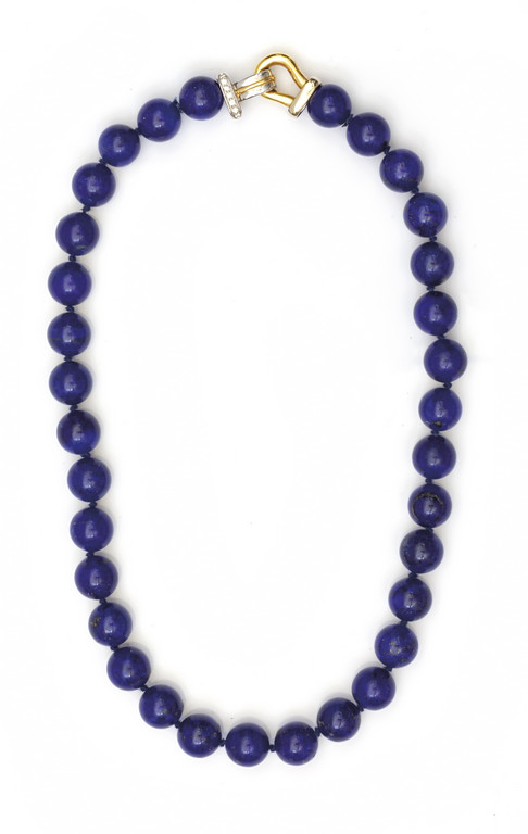 Collana formata da sfere in lapsilazzulo da mm 10 con chiusura in oro giallo e bianco sulla quale sono incastonati piccoli diamanti taglio brillante
