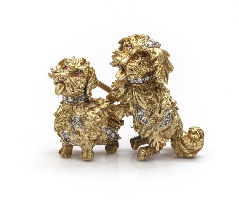 Spilla in oro giallo a forma di due piccoli barboncini con diamanti per tot ct 0,20 circa