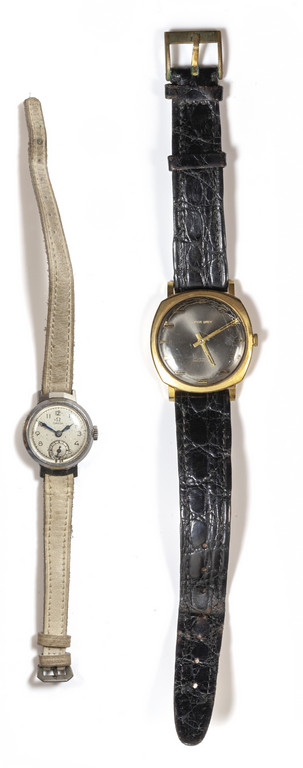 Lotto composto da due orologi di cui uno misura boy in oro giallo marca Sofior Grey, quadrante bronzo, cinturino in pelle nera ed uno da donna in metallo marca Omega, quadrante champagne