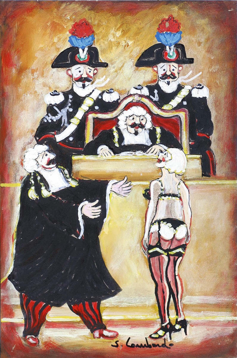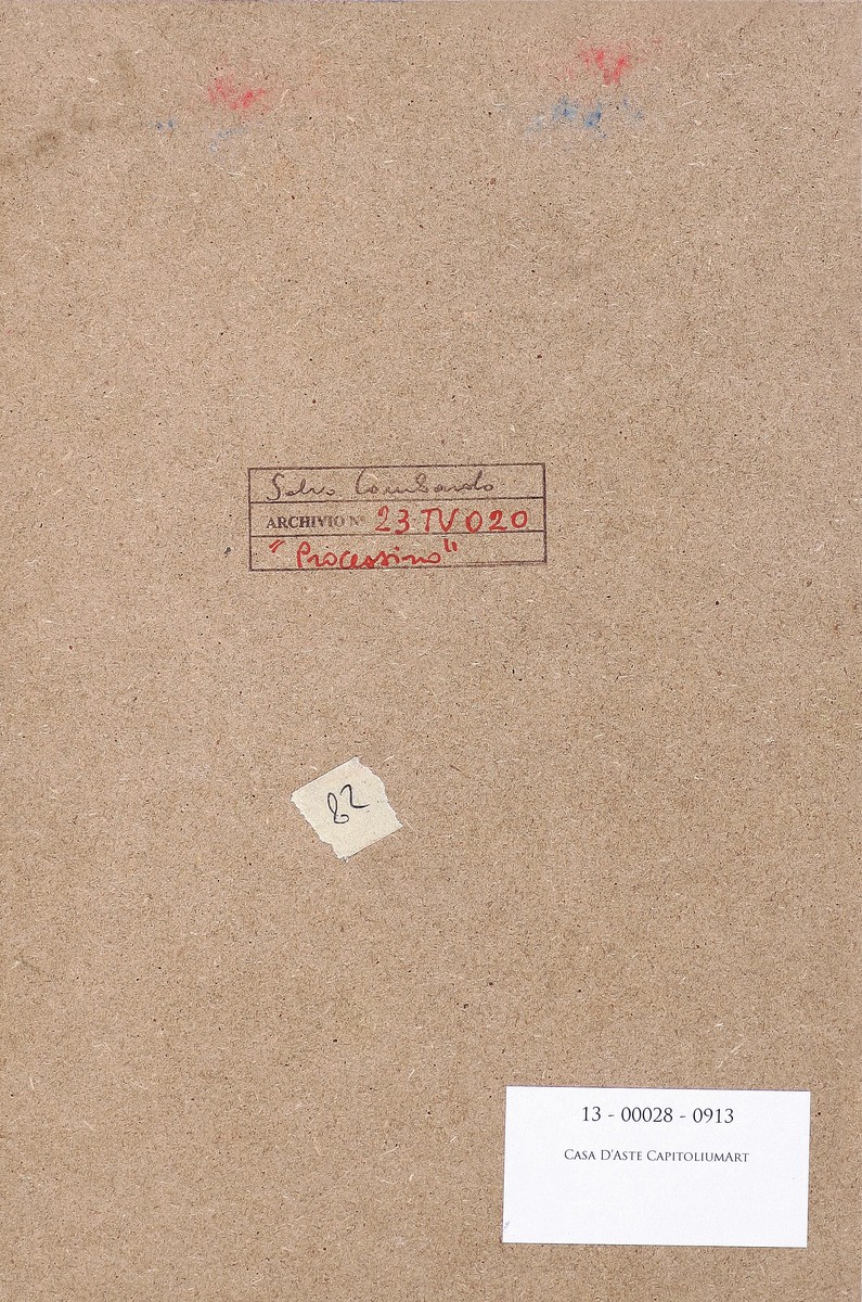 LOMBARDO SALVO (n. 1948) Processino. Tecnica mista su tavola. Cm 20,00 x 30,00. Al retro firma, titolo e numero d'archivio. Firma in basso. Autentica dell'artista su fotografia.