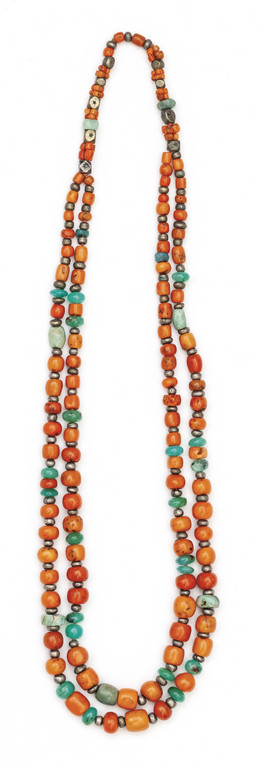 Collana a doppio filo composta da barilotti di corallo tinta salmonato intercalata da dischi in argento e giada