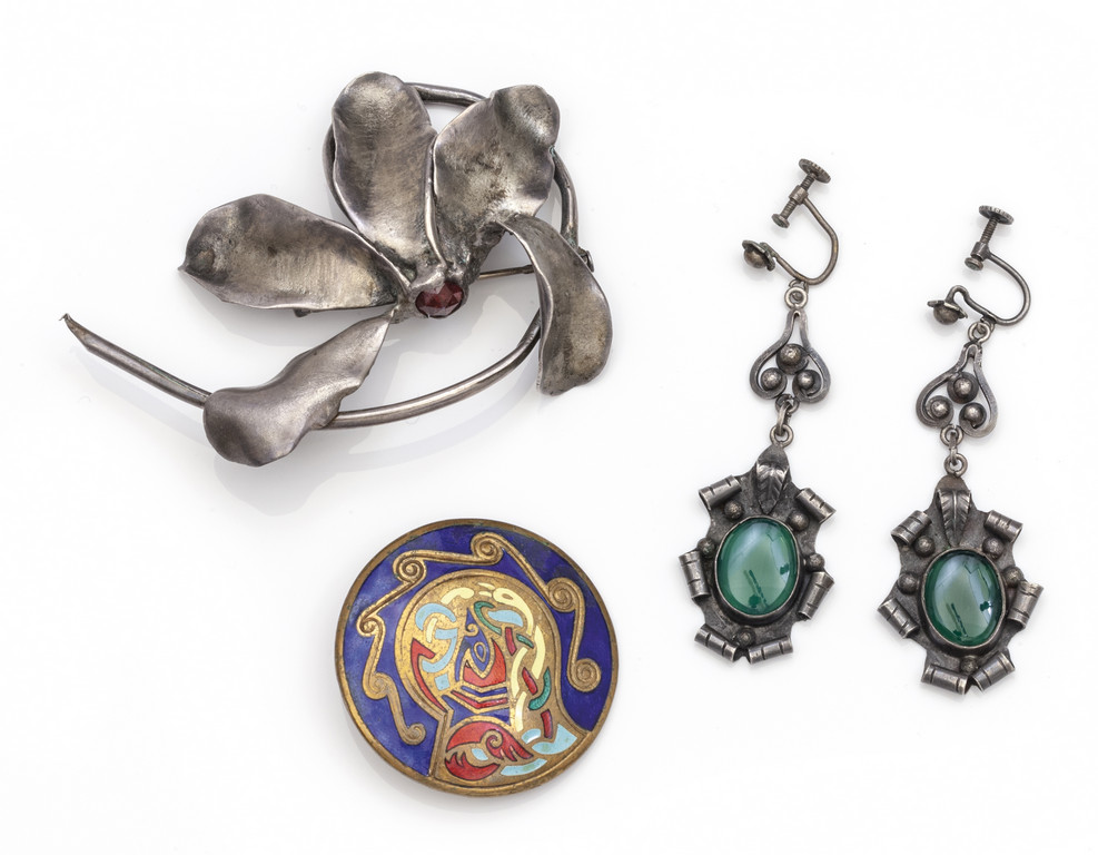 Lotto composto da orecchini in argento, spilla in argento ed una spilla in metallo con smalti