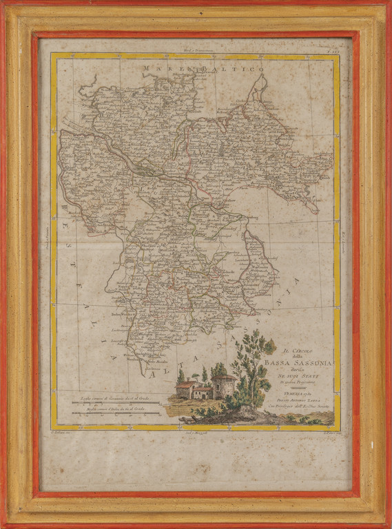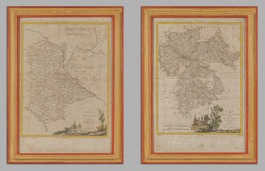 "Il circolo della Bassa Sassonia" e "I palatinati di Braclaw e Kiowa" coppia di stampe, cornici in legno laccato, Antonio Zatta Venezia 1781